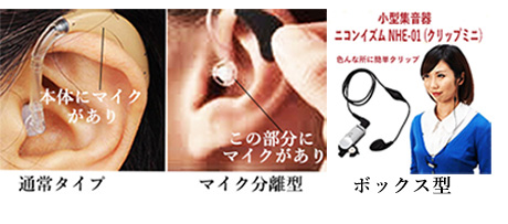 補聴器のスタイル形状は大きく分けて3種類あります。耳かけタイプ・耳穴タイプ・ボックスタイプですそれぞれに長所、短所があります。耳かけタイプは形が大きく目立ちますマイク(集音する所)と耳の鼓膜までの距離が遠いところは短所なりますが、 扱いがしやすく左右どちらにも対応し比較的丈夫です。耳穴タイプはコンパクトで目立ちにくいのと鼓膜までの距離が近いという所は長所です。鼓膜に近いと言うことは歪のない音が届くと言うことになります。また、耳かけタイプの中にはマイク分離型補聴器もあり、マイクが本体から分離され耳穴へ差し込む部分にありより鼓膜近くに差し込む事が出来ます。