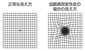視界の中心部分が歪んで見えたり黒くぼやけたりします。加齢黄斑変性 と言っても一般には馴染みのない病名かもしれませんが、欧米では成人の失明原因の1位の珍しくない病気です。
