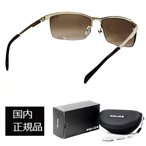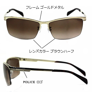 ワイルドなイメージのハーフリムフレームフレームカラーはゴールド レンズにはブラウンハーフカラー テンプルサイドにゴールドの配色POLICEのロゴが入っています