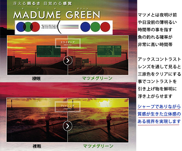 スペアーレンズにマツメグリーンを採用マツメとは夜明け前や日没前の薄明るい時間帯のことでハイコントラストレンズ をかける事によりコントラストがハッキリとして目にも優しく集中力を高めてくれるでしょう